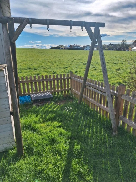 Es Querbalken befinden sich Befestigungen für eine Schaukel und für eine Hängeschauke