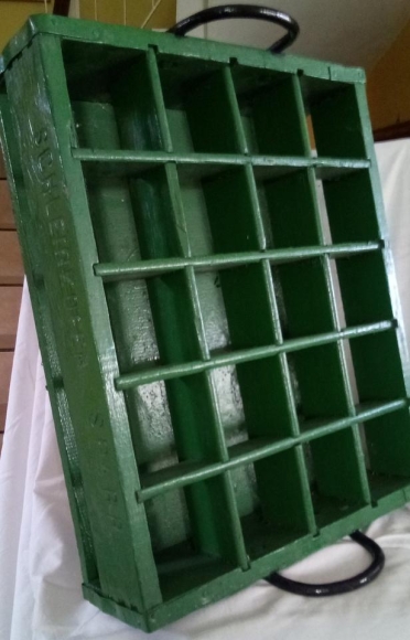 Bierkasten, aufgelassene Brauerei Schleinkofer, Sparr (Bayern), ca. 100 Jahre alte, massiv Holz. Umgeformt zu Setzkasten, gestrichen grün. Dekostück für Ferienwohnung, Ferienhaus, Landhaus, auch Stadt, rustikales Ambiente, Partyraum, Deko auch für Gasthäuser, Wirtsstube (retro), Pension etc., Maße Höhe/Breite/Tiefe, 50/38/10 cm