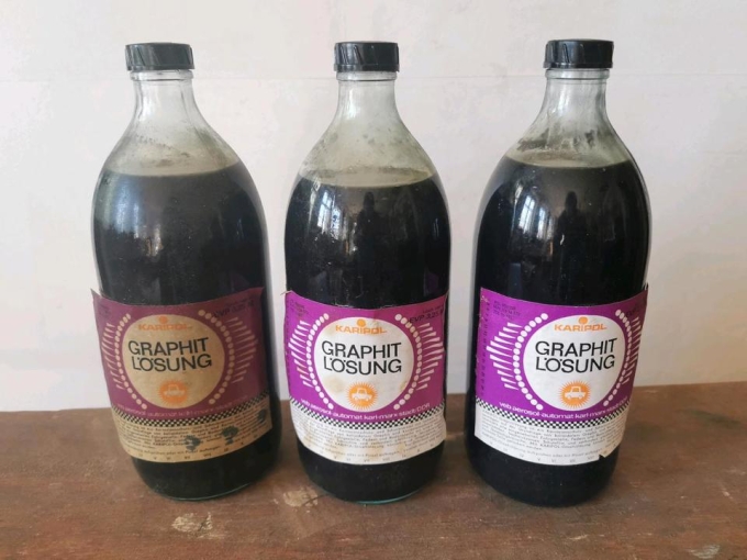 Vom Opa noch aus der DDR sind diese drei Flaschen von Karipol Graphitlösung zu verkaufen.