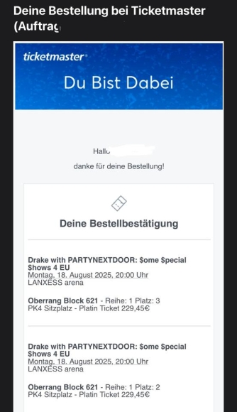 Ich verkaufe 3 Platin Tickets für das Drake Konzert am 18.08.2025 in Köln Lanxess Arena.