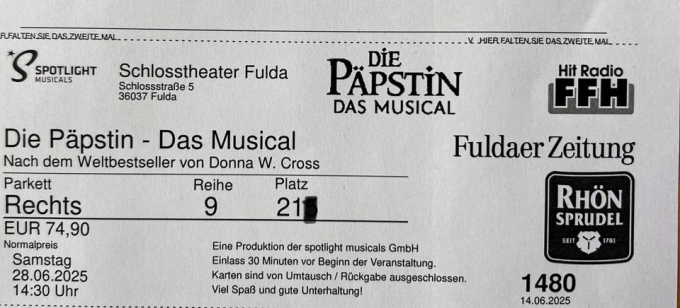 1 Ticket „Die Päpstin“ in Fulda 28.06.25