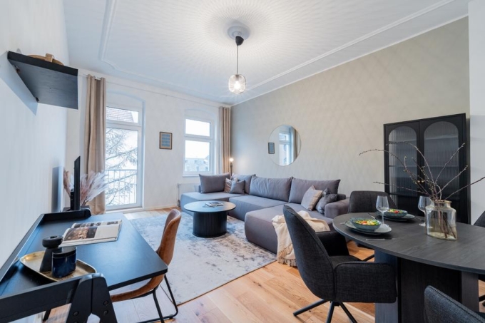 This stunning apartment in the heart of Wedding, Berlin, offers a spacious and stylish living space spanning 66 square meters. Ideal for urban professionals or couples, this one-bedroom haven effortlessly blends comfort with functionality. The bedroom is a tranquil retreat, featuring a luxurious king-size bed, a generous built-in wardrobe, and a cutting-edge 4K TV for your entertainment needs. The living room is equally inviting, with a cozy sofa and an additional large 4K TV, perfect for relaxing after a long day. Next to the living area, a dedicated dining space offers the perfect setting for cozy meals or get-togethers.