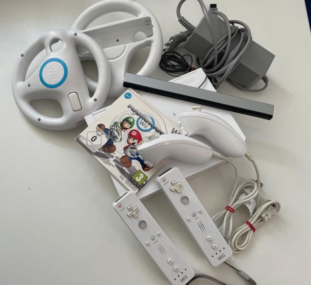 Wii konsole mit 2 controller, 2 nunchuck, 2 Lenkräder, Mario Kart und dem nötigen Standardzubehör.