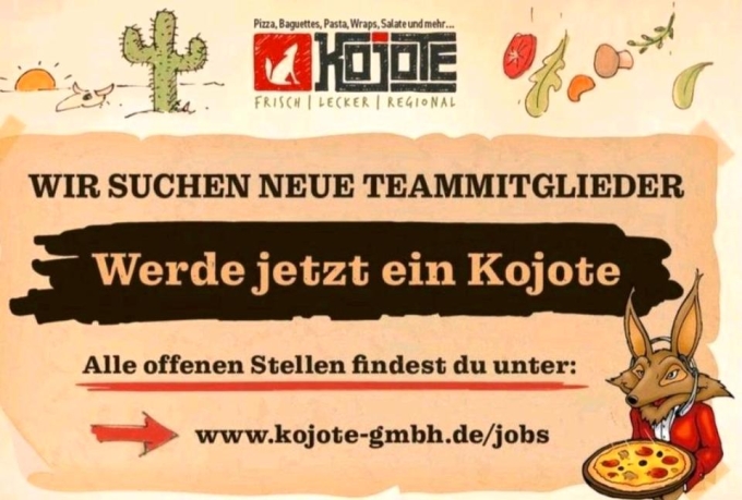 Pizza, Baguettes, Pasta, Wraps, Salate und mehr... das bietet die Kojote GmbH ihren Kunden. Mit ca. 60 Mitarbeitern verarbeiten wir frische Zutaten im Rahmen der Systemgastronomie. Drei Franchise-Filialen gibt es bis heute in Niedersachsen und wir wollen wachsen. Seien Sie mit dabei!