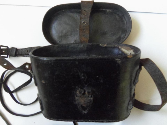 ein sehr altes Fernglas, mit Kompass, Ledertasche, es ist aus Messing, darauf ist " 2x8 Gläser " eingraviert