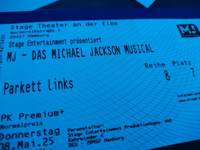 Ich biete 2 Eintrittskarten für das Michael Jackson Musical im Stage Theater in Hamburg für die Vorstellung am 08.05.25, 19:30 Uhr.