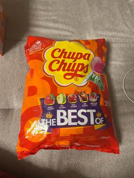 Ungeöffnet wird hier eine große Packung Chupa Chups mit 250 Stück Lutscher in 5 Geschmacksrichtung