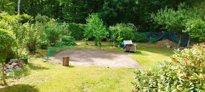 dort sind 5 Apfelbäume, 2 Pflaumen Bäume, ein Birnbaum, Sauerkirschen, 3 Stachelbeeren, Himbeeren.
