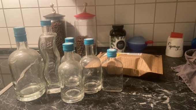 Ich verschenke mehrere Flaschen in verschiedenen Größen und Formen zum Nachfüllen vom Fass, muss ja nicht sein, dass man sich neue kauft wenn man etwas vom Fass (dem Laden) kauft.