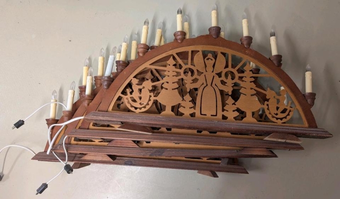 Das Holz ist noch top, die Kerzen sind etwas vergilbt und die Stecker wurden durch andere ersetzt und müssten zurückgebaut werden. Also mit ein wenig Fleiß 4 schöne Schwibbogen zum kleinen Preis machbar.