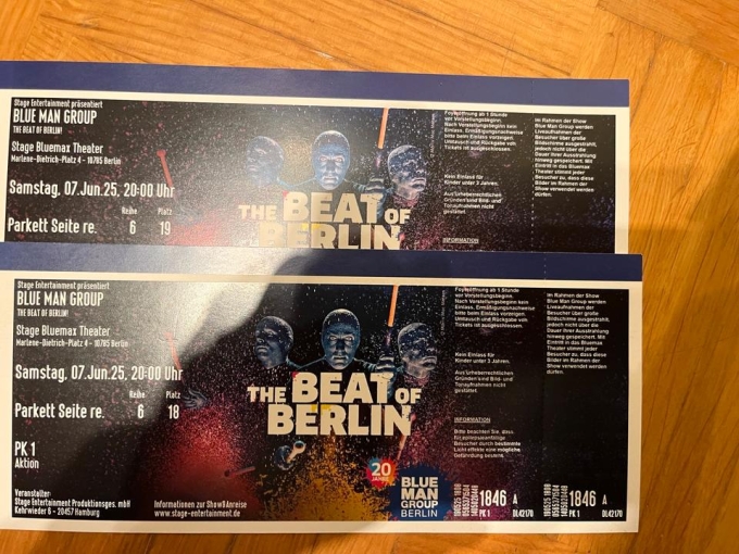 Ich biete 2 Karten für die Blue Man Group Berlin am 07.06.2025 an. Platz siehe Foto.