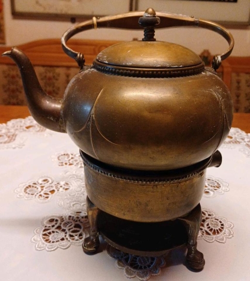 Hübscher Teekessel mit passenden elektrischen Stövchen aus den 30ger Jahren. Ich denke, es handelt sich um Messing. Irgendwer hat auch mal mit dem putzen angefangen, es sind noch Putzmittelreste zu sehen. Ein Kabel dazu gibt es nicht mehr, daher kann ich die Funktion der Heizplatte auch nicht testen. Der Kessel hat ein Fassungsvermögen von knapp 2 Litern.