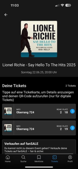 Hallo Zusammen, leider muss ich aufgrund eines Krankheitsbedingten Ausfalls meine zwei Lionel Richie Tickets verkaufen. Es war ein Geburtstagsgeschenk für meine Mutter und ich würde diese ungern verfallen lassen. Ich biete die Tickets zu einem mehr als fairen Preis an damit jemand einen tollen Abend mit guter Musik verbringen kann.