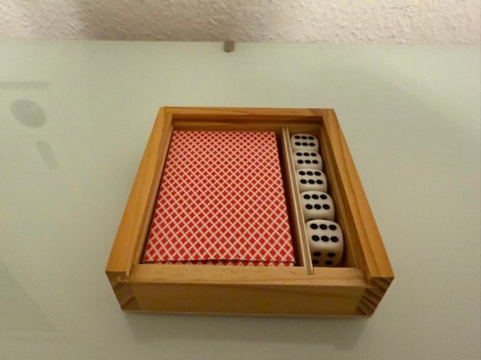 Biete hier ein neues unebnutztes Paket aus Spielkarten mit 5 Würfeln in praktischer Holzbox an.