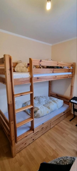 Ich biete hier ein Etagenbett aus Echtholz an, welches in einem top Zustand ist. Matrazenmaß ist 2,00 x 1,00 Meter. Das Bett hat eine Gesamthöhe von 1,75 m, obere Liegefläche Unterkante ist 1,30 m hoch und kann auf 1,00 m runtergebaut werden.