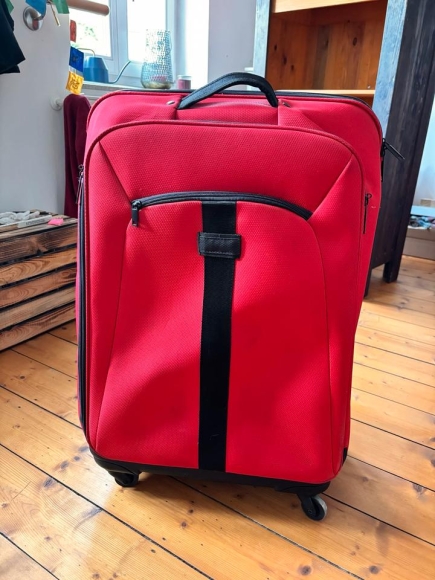 Sehr leichter und robuster Koffer. Der vordere rote Teil besteht aus Textil, der hintere schwarze Teil aus Hartplastik.