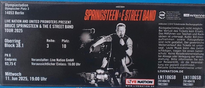Ich biete eine Sitzplatzkarte für Bruce Springsteen & the E-Street Band am 11.06.2025 an.
