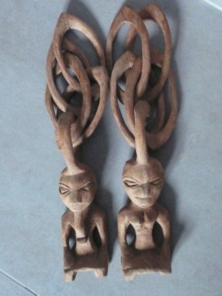 2 Kettenelemente mit je einer weiblichen und einer männlichen Figur jeweils aus einem einzigen Stück Holz geschnitzt. Die einzelnen Ringe greifen ineinander. Handarbeit. Vintage.