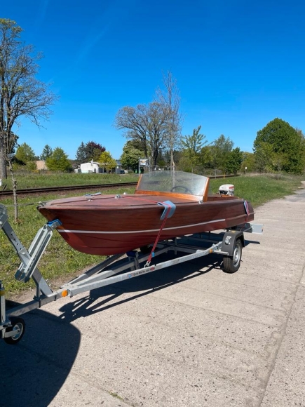 Schickes Holzboot an Bastler abzugeben. Der Trailer ist neu und wurde für das Boot angepasst. Papiere für den Motor, Boot und Trailer sind inklusive.