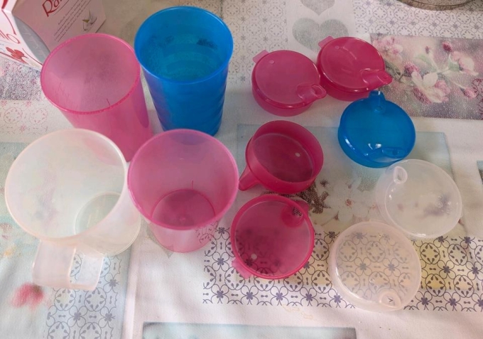 Set aus Trinkbecher mit 2 unterschiedlichen Deckeln: 1x Trink-Öffnungs-Durchmesser 4mm für Flüssigkeiten & 1x Trink-Öffnungs-Durchmesser 12mm für Flüssigkeiten, Suppe, Brei etc.