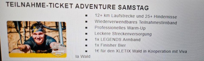 Ich verkaufe ein Xletix-Ticket für Samstag den 24.05.25 inkl. Parkplatz. Das Sport-Event findet im Offroadpark Zossen, Zum Waldstadion , DE-15806 Zossen statt.