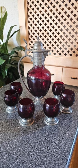 ein Glaskrug mit einem Silbernen Rand mit 6 gläser.
