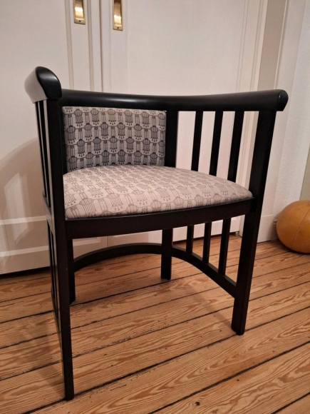 Sehr schöner Bugholzstuhl im Jugendstil nach einem Entwurf von Josef Hoffmann. Der Bezug ist aus dem Stoff Lamps von Josef Hoffmann gefertigt. Auf der Sitzplätze leicht ausgeblichen.