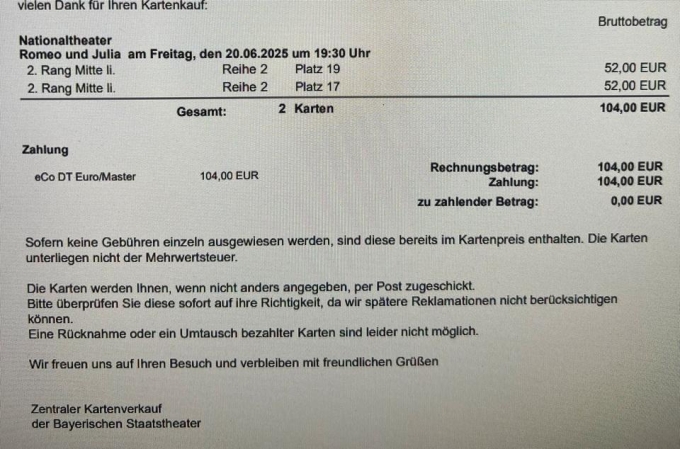 Ich verkaufe 2 Ticktes für das Nationaltheater mit dem Stück Romeo und Julia am 20.06.2025.
