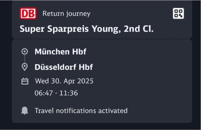 Verkaufe mein Zugticket von München nach Düsseldorf, da ich kurzfristig schon einen früheren Zug nehmen muss.