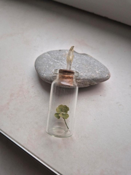 Ich verkaufe ein echtes sechsblättriges Kleeblatt, das sorgfältig in Silicagel getrocknet und anschließend in einem kleinen Glasfläschchen mit Korken konserviert wurde.