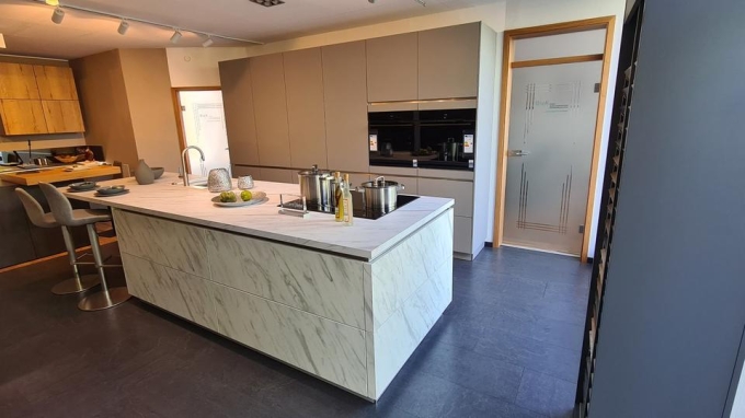 Ausstellungsküche mit großer Insel (Ohne Geräte, Spüle, Mischer)