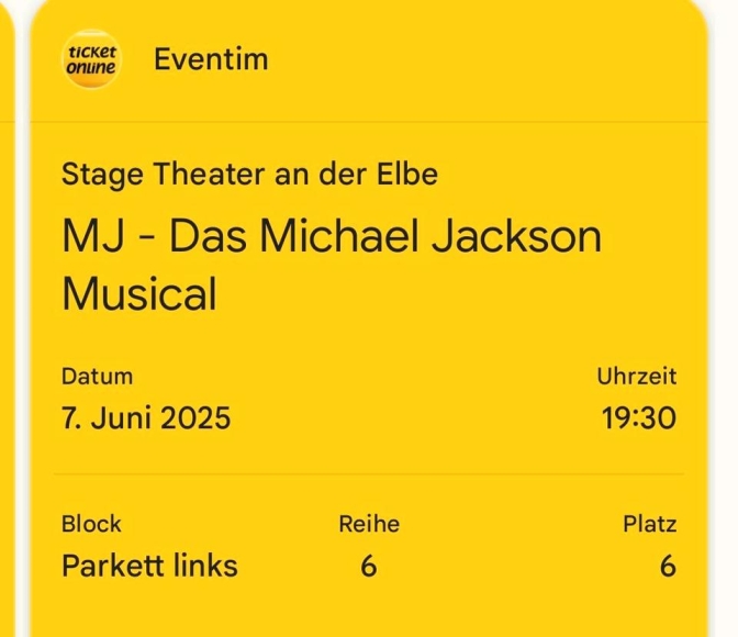 Verkaufe 1 Karte für MJ - Das Michael Jackson Musical am 07.06.2025, 19:30 Uhr, Stade Theater an der Elbe, Norderelbstr. 8, 20457 Hamburg