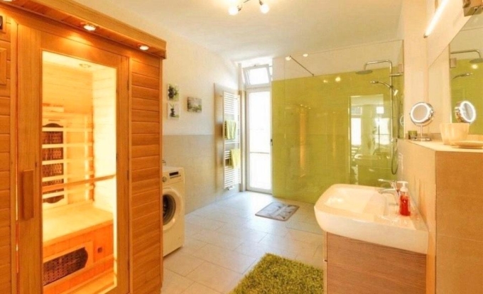 große ebenerdige Dusche, spülrandloses WC, Waschtisch inkl. Unterschrank, Infrarot-Wärmekabine für zwei Personen, Handtuchtrockner, Fön, Waschmaschine (bei Nutzung ohne zusätzliche Kosten)