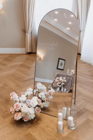Einen Spiegel als Willkommensschild zu nutzen, wird auf Hochzeiten immer beliebter. Unser Welcome-Mirror besticht durch seine Eleganz und Ästhetik.