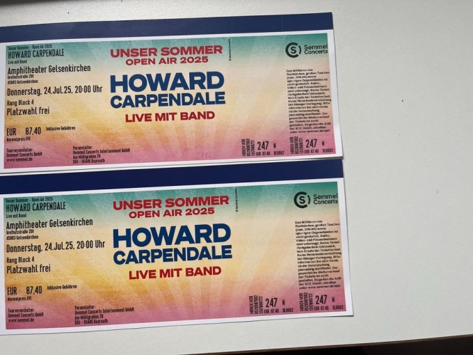 2 Konzertkarten für Howard Carpendale Live mit Band abzugeben. Im Amphitheater in Gelsenkirchen am 24.7.2025 - Open Air. Originalpreis pro Karte: 87,40. Die Karten wurden uns geschenkt, wir sind aber leider im Urlaub.