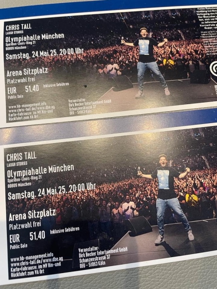 2 Original Karten für Chris Tall München. Sitzplätze Arena Innenraum.
