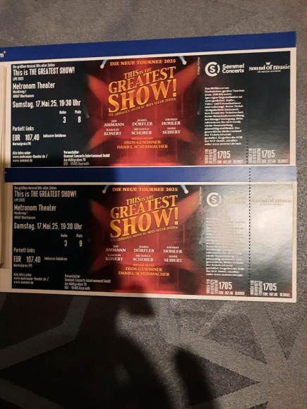 Ich biete 2 Tickets für "This is the greatest Show" am 17.05.2025 um 19:30 Uhr in Oberhausen. Die Plätze befinden sich im Parkett links Reihe 3, Platz 8 und 9. Ich würde die Tickets zusammen für 210 Euro abgeben.