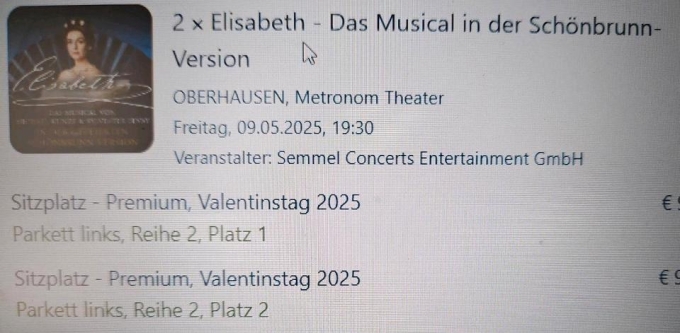 2 Tickets Musical Elisabeth - 09.05.25 - Reihe 2 !