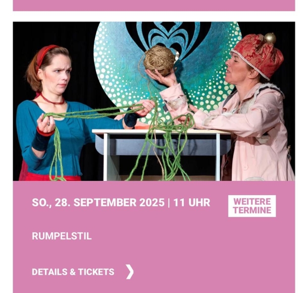 Wie die brave Müllerstocher sich doch noch als eine selbstbewusste junge Frau entpuppt, mit Rumpelstil einen Deal aushandelt und was die Geschichte für ein unerwartetes Ende findet, erzählt das Theraterstück mit Live Musik, einem großen Zauberkreisel, Poesie, Tanz und Humor