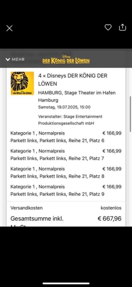 4x Disney König der Löwen PK1 19.07 Tickets Stage Musical