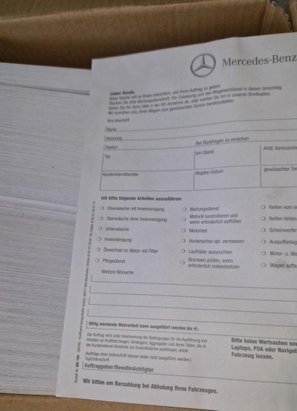 In so eine Tasche legt ein Kunde seinen Mercedesschlüssel sowie den Fahrzeugschein. Vorher hat er die gewünschte Dienstleistungen angekreuzt und unterschrieben. Er parkt seinen MB vor der MB-Werkstatt und legt diesen Umschlag in den Nachtresor des MB Autohauses. Auf diesem Wege wurde ein entsprechender, rechtssicherer Auftrag erteilt und für den Kunden ist so ein "Nachteinwurf" vielleicht auch die angenehmste, schndllste Variante.