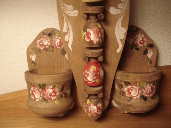 6 Eierbecher m. Hängeregal 2 Wandbehälter Bauernmalerei Holz 70er
