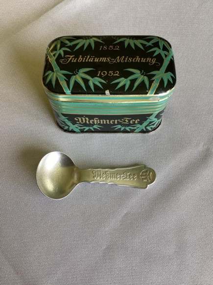 Zum Verkauf steht eine kleine Metalldose Meßmer Tee mit Originallöffel von 1952.
