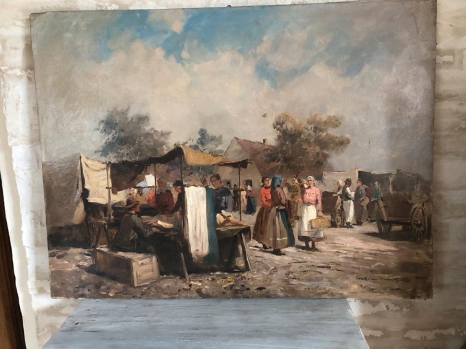 die Händler an den Ständen, Stoffe und Kunsthandwerk anbietend, u.re. signiert