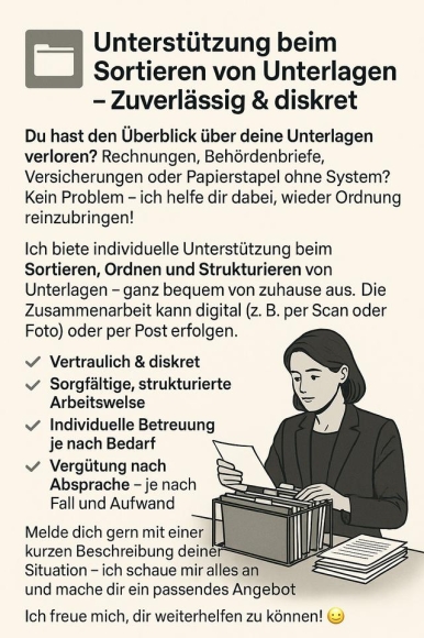 Ich biete individuelle Unterstützung beim Sortieren, Ordnen und Strukturieren von Unterlagen – ganz bequem von zuhause aus. Die Zusammenarbeit kann digital (z. B. per Scan oder Foto) oder per Post erfolgen.