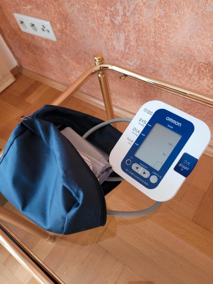 Das Oberarm-Blutdruckmessgerät ist gut erhalten. Gebrauchsanweisung liegt vor.