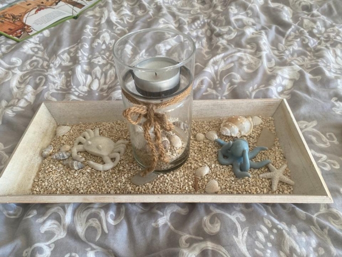 Teelicht mit Holzumrandung, dazu zwei Sterne aus Glas mit Sand befüllt