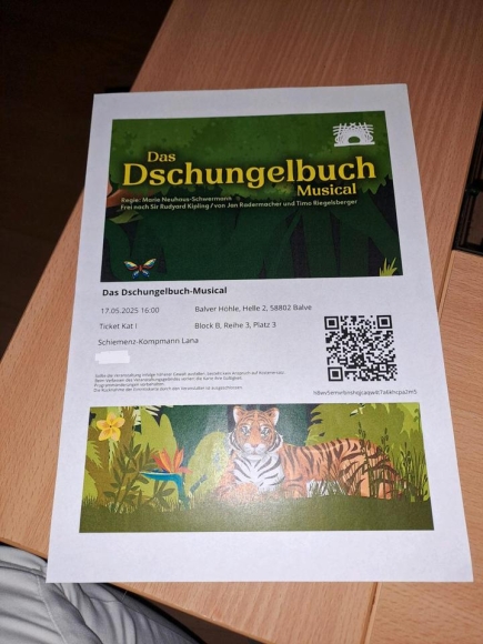 3 Tickets für das Dschungelbuch-Musical in der Balver Höhle am 17.05.25 um 16 Uhr für einen Erwachsenen und 2 Kindet.