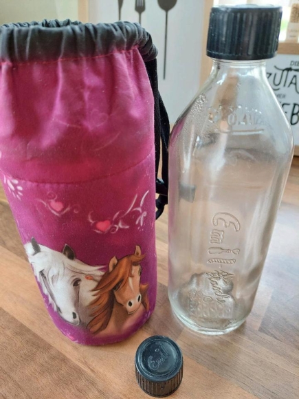 kaum benutzte Flasche. Auslaufsicher. Mit Hülle und Ersatzdeckel.