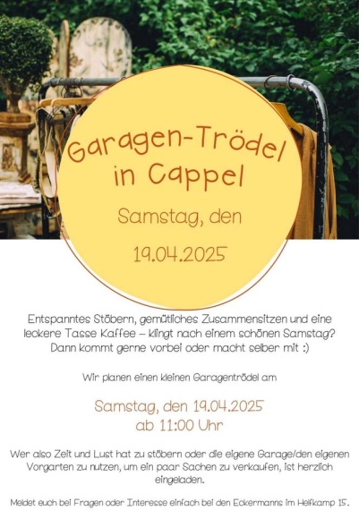 heute, am 19.4. gibts einen Garagentrödel im Helfkamp 15 in 59556 Lippstadt/Cappel.